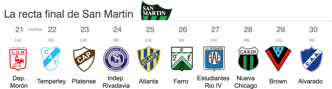 En el último partido como local de esta parte del año, en la fecha 29, San Martín será anfitrión del irregular Brown de Puerto Madryn que está hoy 4 puntos abajo del Verdinegro y apunta a sostenerse en la categoría. Finalmente, en la fecha 30, San Martín tendrá que ir a Mar del Plata para visitar a Alvarado que tiene chances de entrar en ese Reducido aunque hoy está por debajo del conjunto sanjuanino.