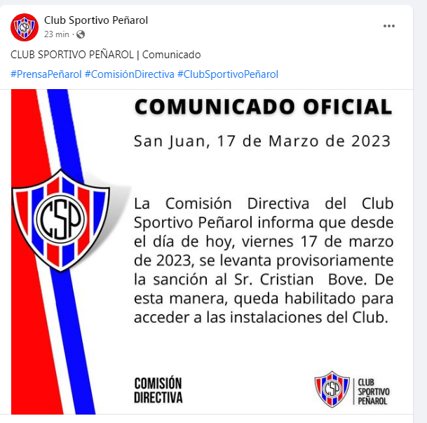 Según la publicación, la CD informó que desde este viernes "se levanta provisoriamente la sanción" a Cristian Bove, por lo que "queda habilitado a acceder a las instalaciones del Club".