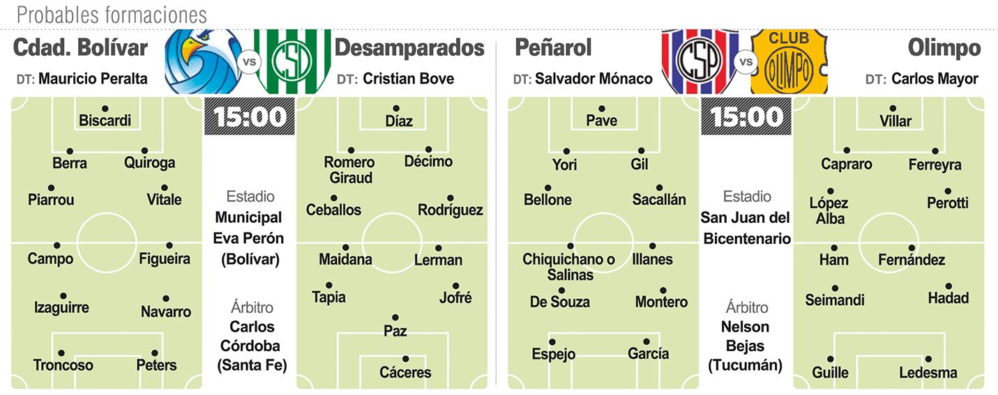 En tanto que en la ciudad de Marcelo Tinelli, Desamparados visitará al novato equipo Ciudad Bolívar. El Celeste no logra asentarse en la categoría y hoy ante Sportivo buscará afianzarse al menos en su cancha. Desamparados viene de vencer a Villa Mitre de Bahía Blanca, triunfo que le permitió ocupar en soledad la cuarta posición. El hecho de estar a cuatro puntos del líder le alimentan la ambición a un Sportivo que teniendo en cuenta sus últimas actuaciones fuera de San Juan, irá por todo. En cuanto a lo futbolístico hoy debutará el arquero Federico Díaz en reemplazo de Dianda (expulsado) y también estará entre los suplentes Matías Garrido, quien se sumó hace casi un mes al plantel y en la semana recibió el transfer que lo habilita a estar hoy entre los convocados. Mientras que otra ausencia será la de Bruno Rodríguez, quien en la semana dio positivo de coronavirus.