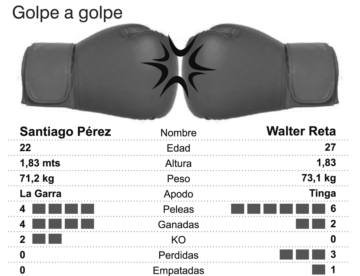 Los dos son altos, el pocitano es cinco años más joven y, a pesar de la inactividad de casi medio año, es propietario de una campaña sin máculas. Está en la curva ascendente de una carrera profesional que recién se inicia. El lasherino, por su parte, debutó de manera rentada en 2013 y en poco más de cuatro años solo realizó dos peleas más que Pérez. La de esta noche será la segunda pelea de la tercera temporada en la que se ha dividido su campaña, realizada casi íntegramente en la categoría mediano (72,575 kg), razón por la cual ayer no dio el peso pactado (71) y se excedió en 700 gramos del límite de la división.