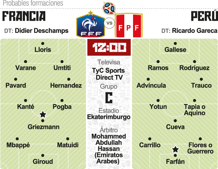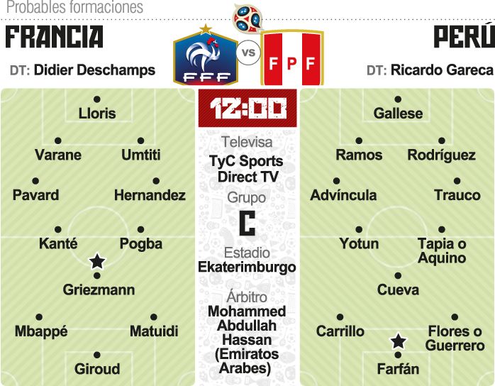 Perú, dirigido por el técnico argentino Ricardo Gareca, jugará -sin margen de error si desea seguir soñando con los octavos de final del Mundial de Rusia- mañana ante Francia, en un partido correspondiente a la segunda fecha del Grupo C. El encuentro se disputará en el Ekaterinburgo Arena, desde las 12 (hora argentina), con Mohammed Abdullah Hassan (Emiratos Arabes Unidos) como árbitro y televisación de TyC Sports y DirecTV.