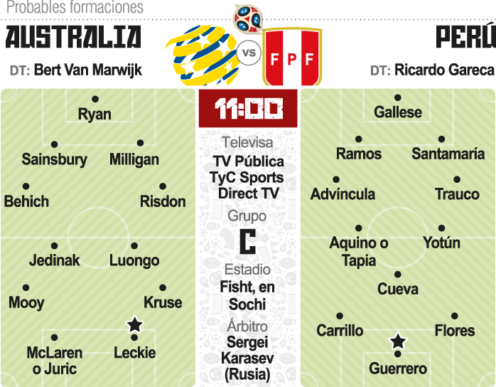 Para conseguir los tres puntos, el seleccionador de Australia apostará por el mismo esquema que ante Francia y Dinamarca, con sus dos laterales titulares, Risdon y Behich, y su estrella, Leckie, apercibidos, y con la única novedad en la delantera, dando entrada a Juric en sustitución de Nabbout.