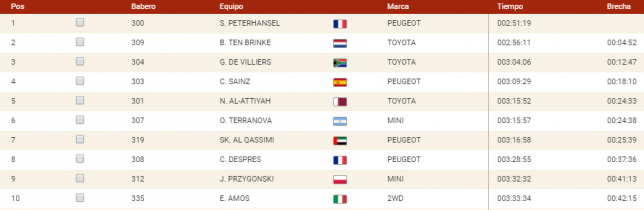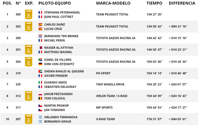 Monsieur Dakar completó la etapa en 2h51m19s y con este triunfo se mantiene como el líder de la clasificación general. El podio del día lo completaron el holandés Bernhard Ten Brinke, a 4m52s, y el sudafricano Giniel De Villiers, a 12m47s.