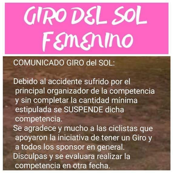 Además, indicaron que había muy pocas chicas anotadas para largar. Por este motivo, es que decidieron suspender la primera edición del Giro de las pedaleras y mediante un comunicado, explicaron que "evaluarán realizar la competencia en otra fecha".