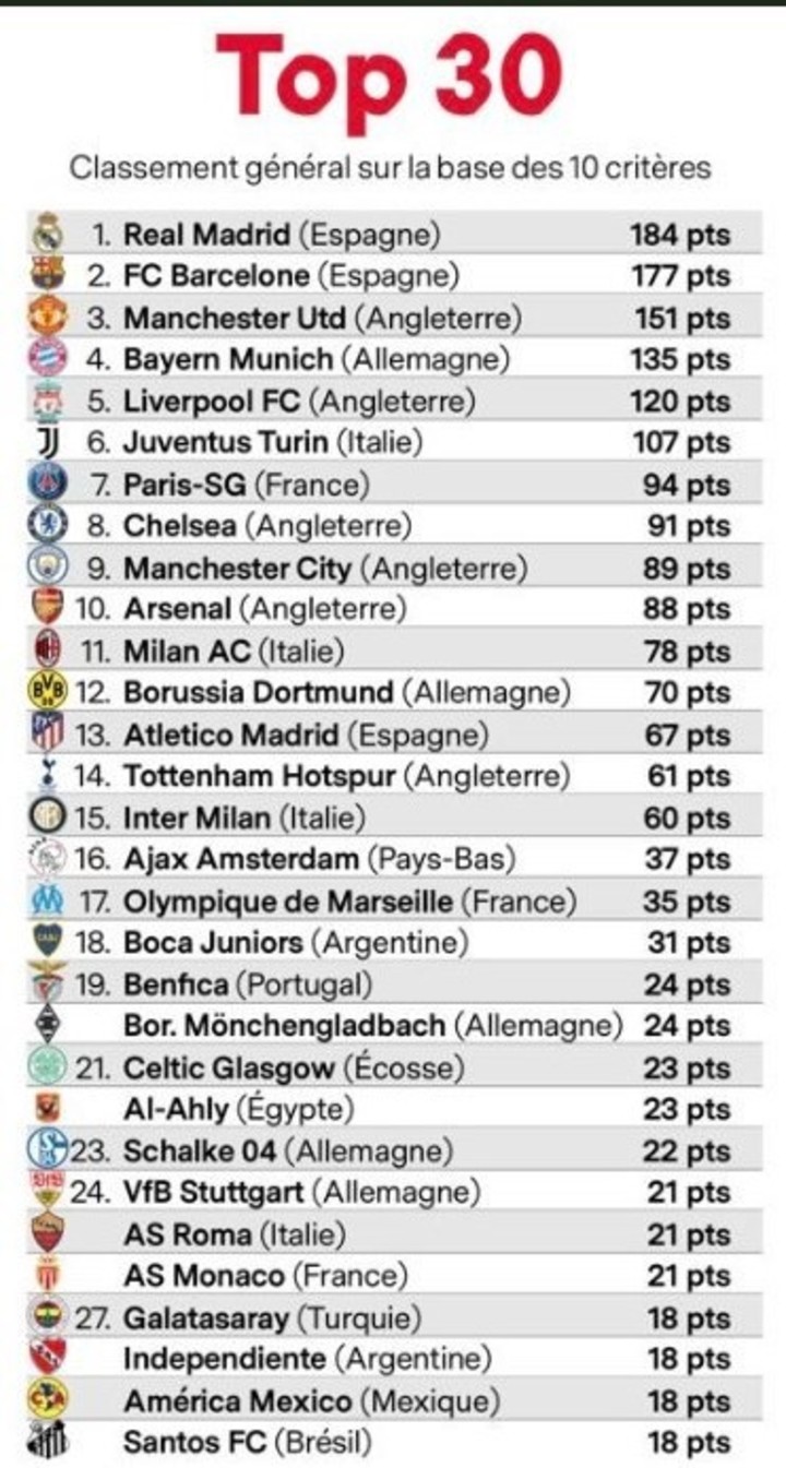 Con estos criterios, en primer lugar se examinaron 85 equipos (de 29 países de los 5 continentes), reduciendo luego ese número a 30. La lista la lidera Real Madrid con 184 puntos y es seguido por el Barcelona con 177. Tercero es el Manchester United con 151 unidades.