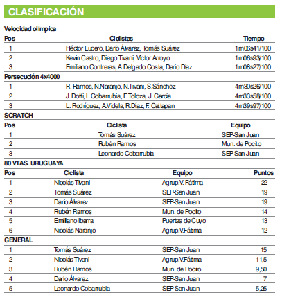 El ciclista sanluiseño del Sindicato Empleados Públicos (SEP-San Juan) Tomás Suárez ganó ayer la penúltima fecha del calendario de pista que fiscaliza la Federación Ciclista Sanjuanina. El puntano, de 20 años, que ha ganado varios títulos argentinos para su provincia coronó con contundencia una tarea impecable de su conjunto que en las 80 vueltas a la uruguaya trabajó coordinadamente para asegurar el triunfo en la clasificación general. A la prueba de fondo que cerró la luminosa y cálida tarde sanjuanina la ganó Nicolás Tivani (Agrupación Virgen de Fátima) pero los puntos que consiguió no le alcanzaron para desbancar a Tomás que junto a Héctor Lucero y Darío Álvarez habían conseguido la victoria en la velocidad olímpica y luego se impuso en el Scratch.