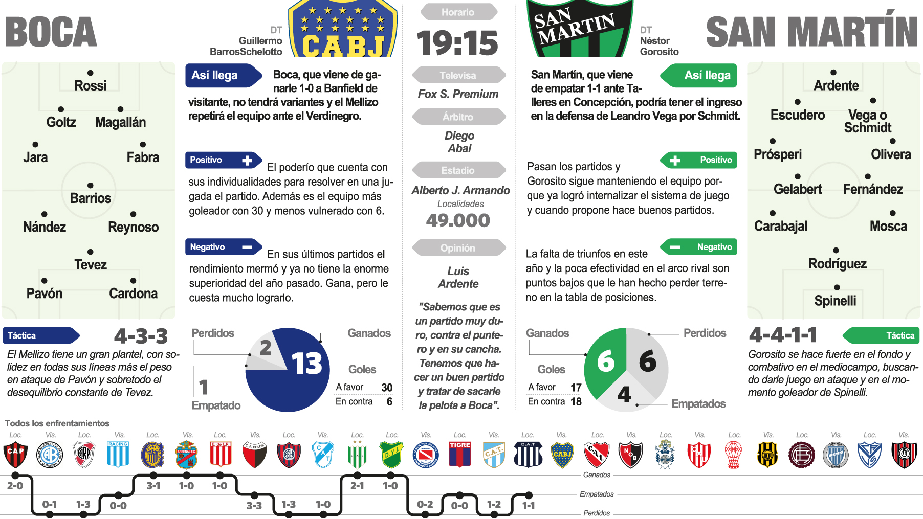 El resto del equipo, al que Gorosito no confirmó, sería el mismo pero podría tener mayor tránsito de juego en la mitad de la cancha, para hacer más combativo el partido y no dejar pensar a Boca. Esto porque San Martín sabe que el rival más allá que gana, que tiene un plantel completo y plagado de figuras, no viene demostrando un gran rendimiento y hoy es vulnerable y se le puede ganar.