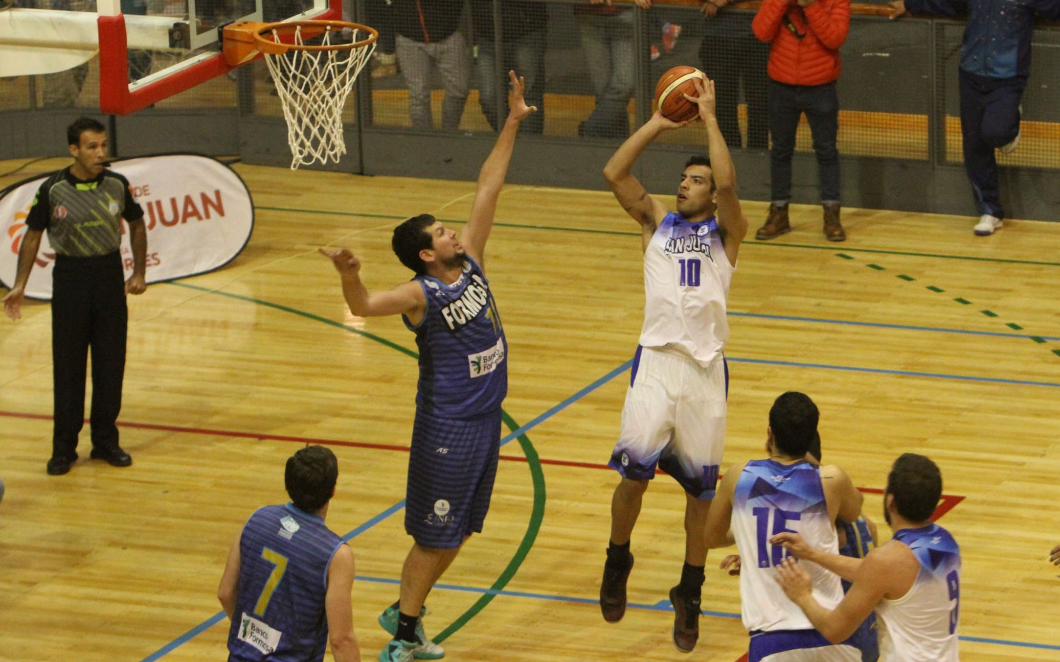 Aporte. El ala-pivot de San Juan, Hugo Castro, anota un doble ante la marca del rival formoseño. El equipo de Sergio Cabañas se medirá esta noche ante Mendoza, desde las 21.30 buscando el boleto al Argentino.