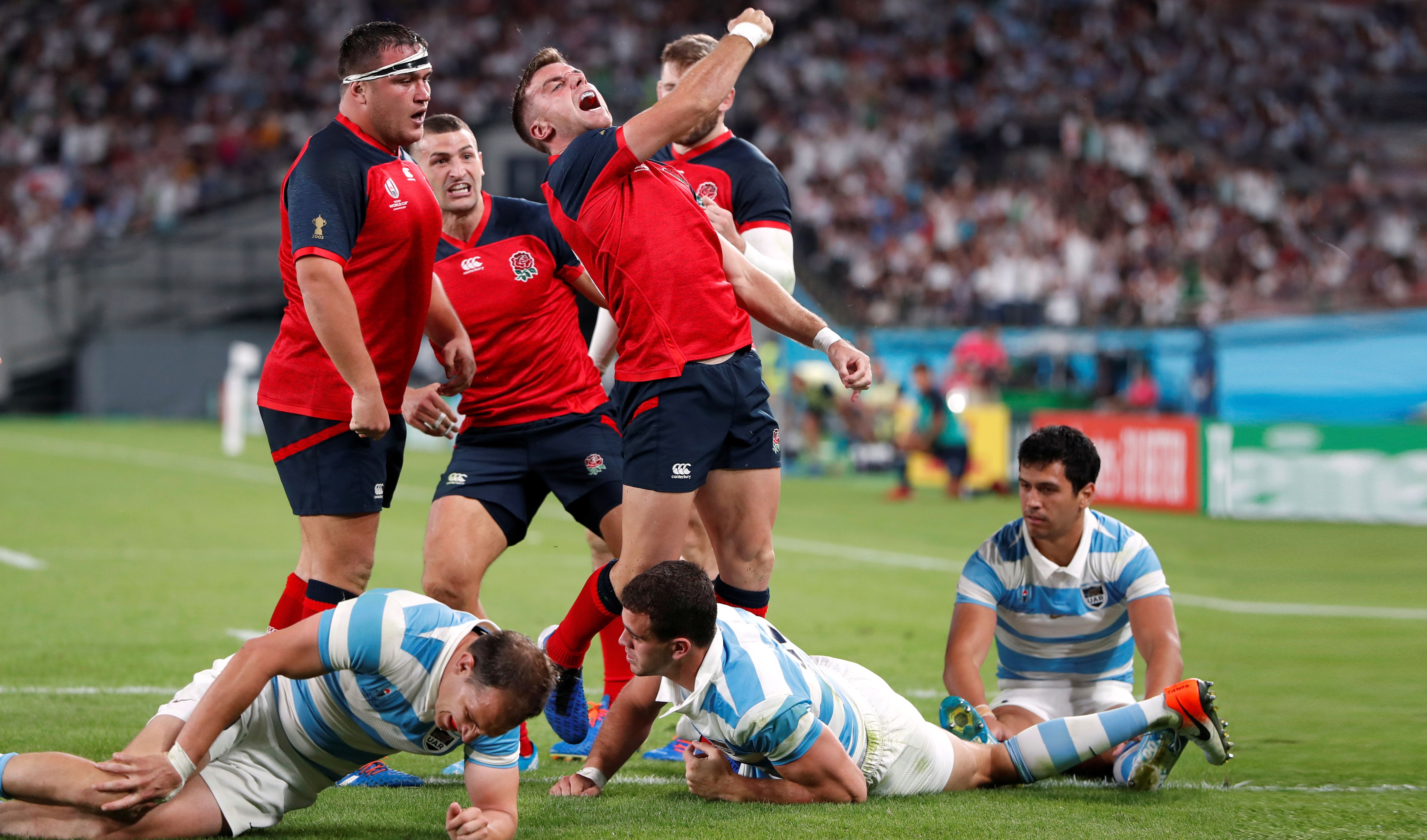 Rendidos. Matías Alemanno, Emiliano Boffelli y Matías Moroni son la cara de la derrota argentina. George Ford celebra el cuarto try de Inglaterra en Tokio que dejó a los Pumas cerca de la despedida en la primera roda.