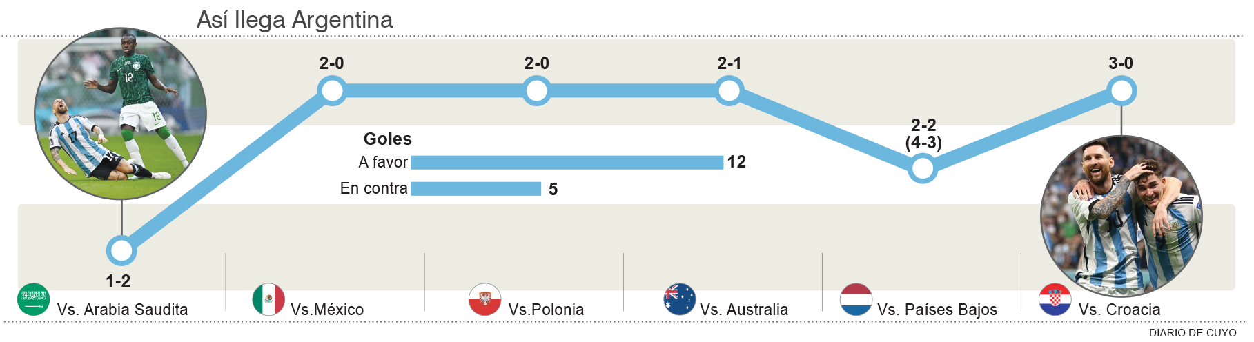 Atrás, ya bastante lejos, quedó el Grupo clasificatorio. El "C". El que dio una sorpresiva derrota ante Arabia Saudita en el debut y dos victorias seguidas: ante México y Polonia. Y ya desde ahí empezó a agigantarse el sueño. Después, la Albiceleste dejó en el camino a Australia (en octavos de final). Más tarde a Países Bajos (en cuartos) y hace unos días a Croacia (en semifinales). Esforzándose. Dando todo. Haciéndole entender a su gente que esta patriada va más allá de cualquier límite imaginable. Y el pueblo argentino lo entendió. Tomó la posta y fue creando un clima extraordinario. Por eso, al margen de cualquier resultado en este partido final de este domingo distinto, la empatía con estos gladiadores será la misma.