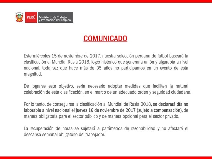 Estaba claro: la chance de entrar al Mundial para Perú era un tema de Estado. Y así se reflejó en la decisión que tomó el Ministerio de Trabajo y Promoción del Empleo de Perú que declaró día no laborable el jueves para permitir que los festejos se extiendan sin problemas ni restricciones.