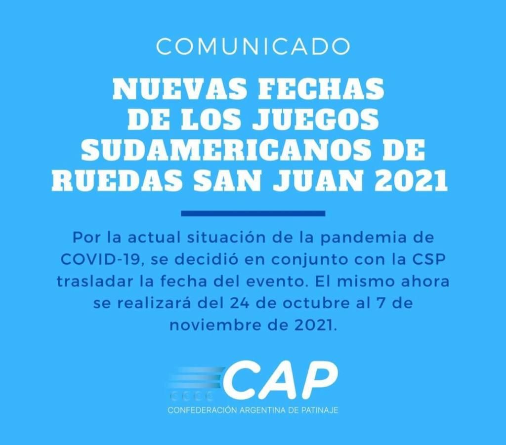 En un comunicado, la Confederación Argentina de Patinaje indicó las nuevas fechas para el evento deportivo, cuyo desarrollo está previsto ahora entre los próximos 24 de octubre y 7 de noviembre.