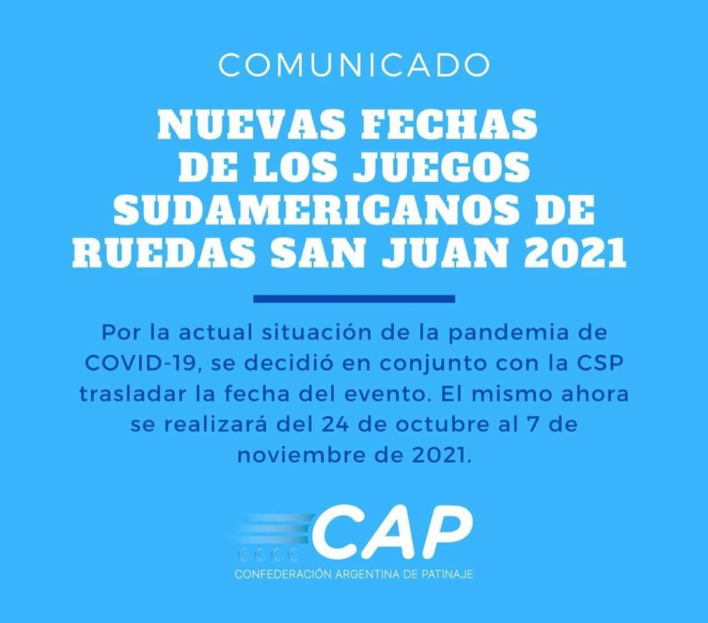A principios de marzo, las autoridades confirmaron que los Juegos Sudamericanos de Ruedas San Juan 2021 se celebrarían en agosto en San Juan. Sin embargo, la escalada del coronavirus obligó a los organizadores a posponerlos y dejaron para finales de octubre próximo.