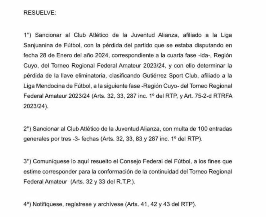 El Consejo Federal resolvió eliminar a Alianza del Torneo Regional Amateur, debido a los incidentes del pasado domingo en su cancha. La resolución indica que al conjunto de Santa Lucía se le dio por perdida la serie ante Gutiérrez y, así, el equipo mendocino avanzó a la final por el ascenso.