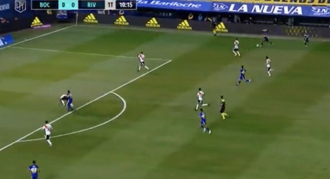 El Apache sacó provecho de la falta para acomodarse en el área y aparecer de forma solitaria; con una palomita algo fallida (la pelota le da en el hombro antes de superar la línea del arquero Alan Díaz) convirtió y abrió el Superclásico. En este caso Tello debió haber sancionado infracción en ataque de Tevez sobre Maidana ya que las cargas sobre la espalda no están permitidas y se miden por la fuerza aplicada y sus consecuencias.