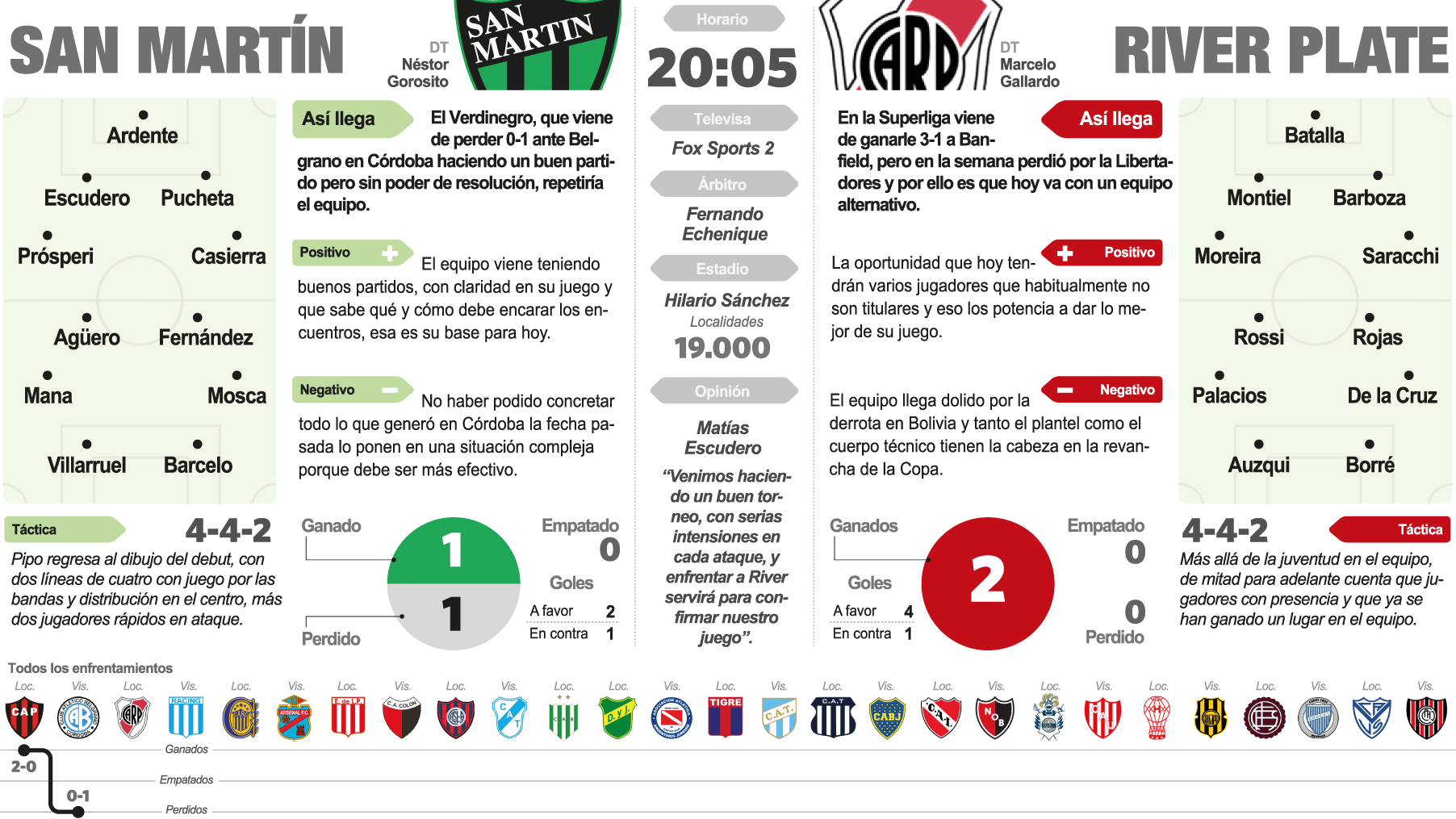Será un partido con realidades muy diferentes. En San Martín para confirmar su buen momento futbolístico más allá de haber perdido la fecha pasada ante Belgrano (1-0), siendo un equipo que toma la iniciativa y que a demostrado tener un manejo de la pelota y de los espacios que lo hacen animador. Mientras que para River servirá para recuperarse tras sufrir una dura derrota en la semana por Copa Libertadores frente a Jorge Wilstermann en Bolivia, por 3-0, que llevó a que hoy su principal objetivo esté puesto en dar vuelta la serie de cuartos de final el próximo jueves. Y por ello hoy Gallardo apostará por un equipo alternativo, con la gran mayoría de jugadores que habitualmente son suplentes y con otros que integran el plantel de Reserva, como el sanjuanino Zacarías Morán Correa.