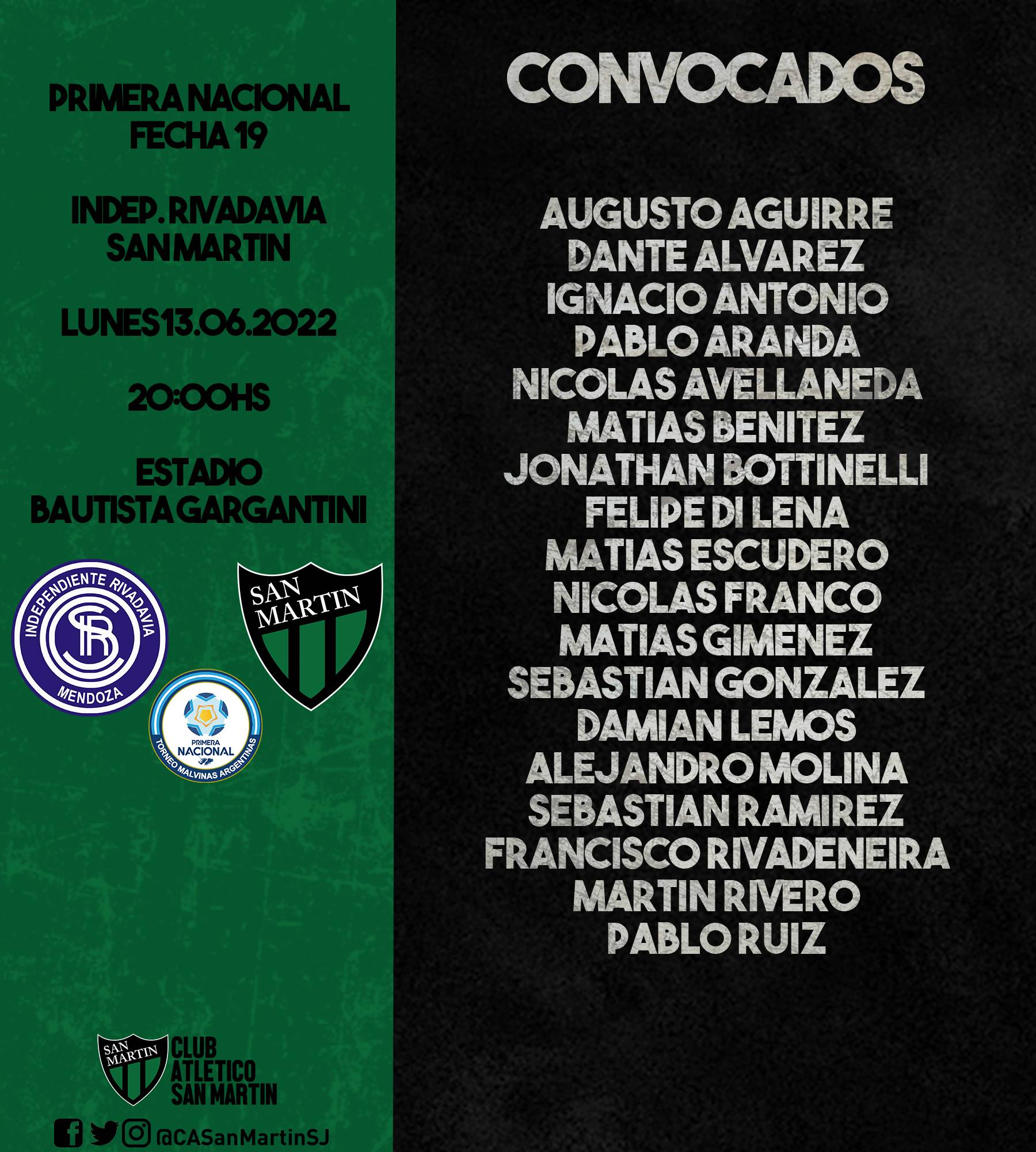 San Martín tendrá este lunes a las 20 horas un choque fundamental para sus aspiraciones por meterse de lleno en la zona de clasificación. El Verdinegro visitará en Mendoza a Independiente Rivadavia de Mendoza en una nueva edición de un clásico siempre atrapante Mendoza vs San Juan. Para ese encuentro, Raúl Antuña no tendrá a Sebastián Penco entre los convocados por una lesión.