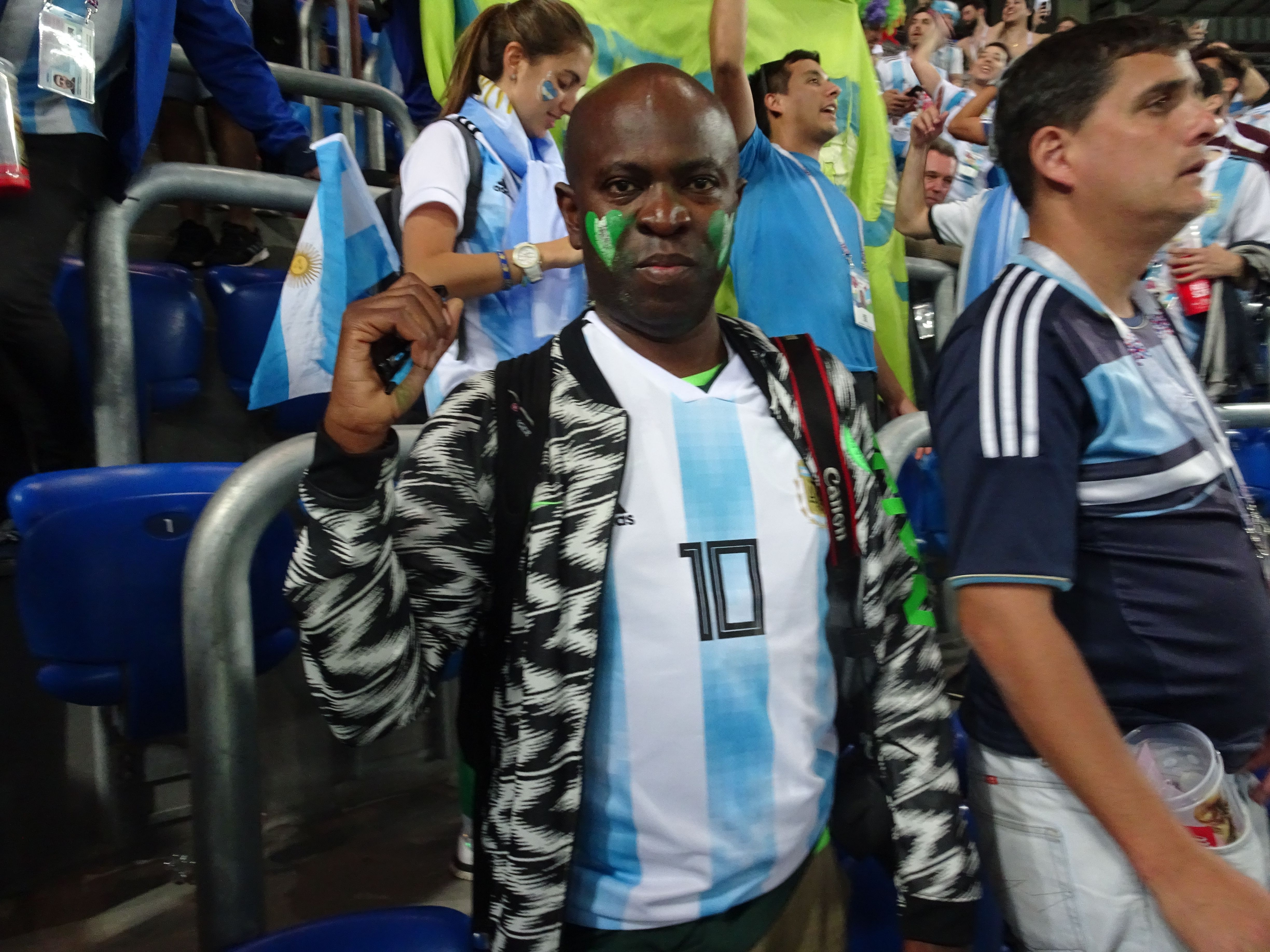 Aghbel es un nigeriano fanático de Lio, que aunque enfrentó a su Selección se fue con este atuendo al partido en San Petersburgo. No sólo se puso la albiceleste con la 10 de Messi, tras la eliminación de su equipo igual se quedó festejando con los hinchas argentinos contagiado por la alegría de éstos.