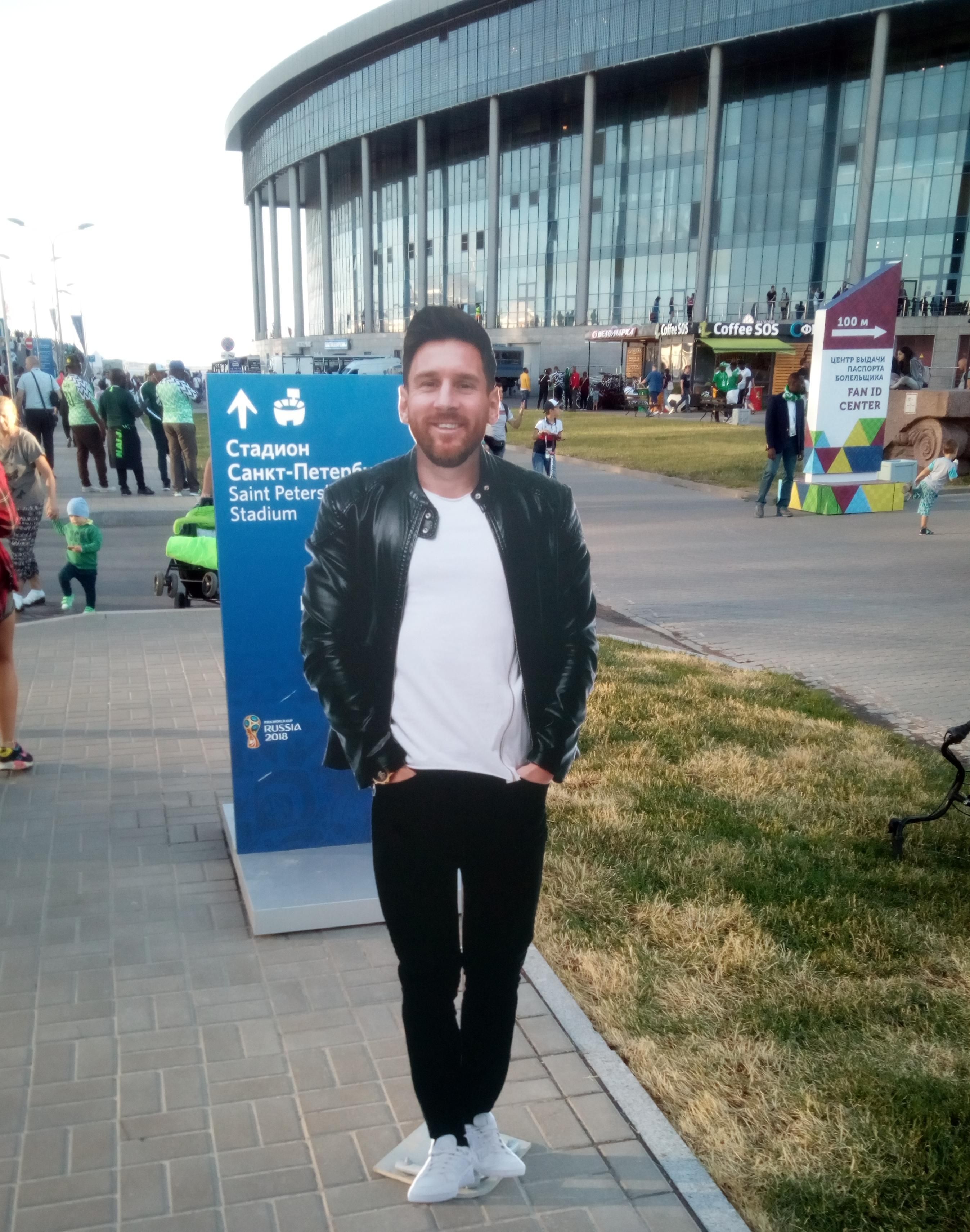 Lionel Messi es una mina de oro y si encima se está jugando un Mundial, ni hablar. Una pareja de rusos diseñó esta silueta del capitán argentino y se colocó en la entrada principal al estadio. "One dólar" avisaban a cada hincha entusiasmado que se acomodaba para la selfie.