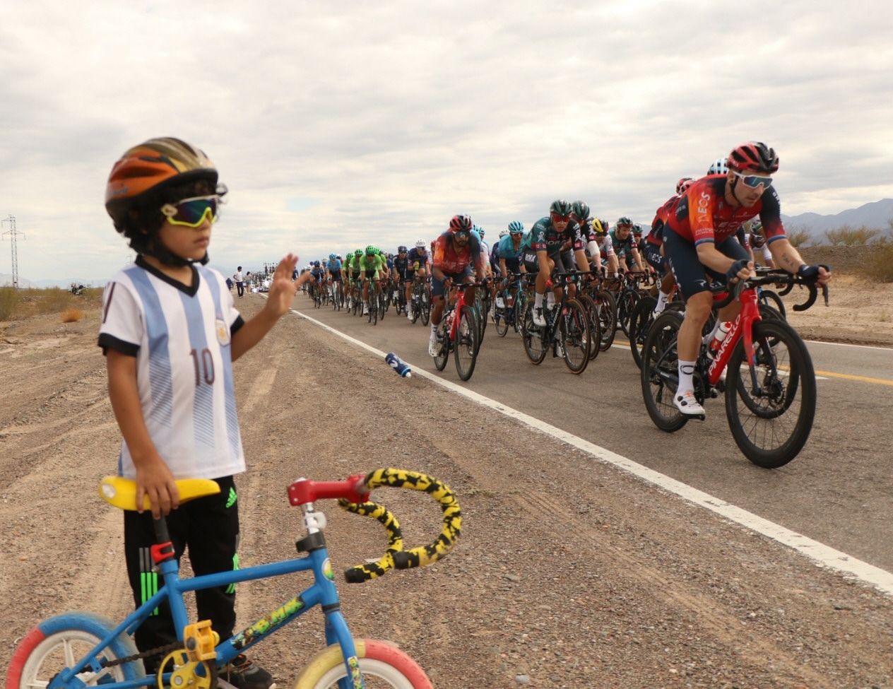 Los ídolos, de cerca. Una nene con su querida bicicleta ve el paso del pelotón, con los equipos de elite en primera fila.