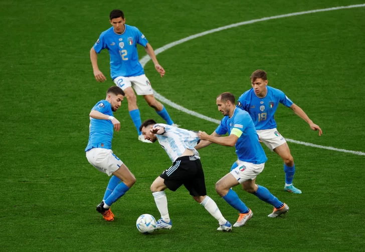 Aunque ante la Azzurra jugó con la clásica celeste y blanca, con la que venían de ganar la Copa América en el Maracaná en 2021, parte de los festejos fue con la alternativa. Es que la remera suplente fue tuneada para la ocasión: le estamparon el trofeo en el dorso y le pusieron un parche gigante de "Campeones Finalissima 2022".
