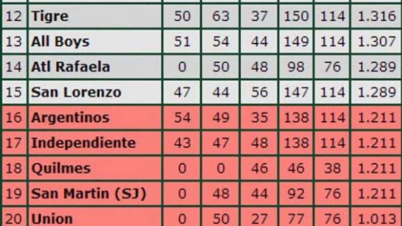 El tema es que puede haber un partido desempate por el descenso, o tal vez un triangular, y por qué no un cuadrangular. ¿Cómo sería este último caso? Si San Martin suma (15, 13, 11 o 9 puntos), Independiente (15, 12, 9 o 6 puntos), Argentinos (12, 9, 6 o 3) y Quilmes (7, 6, 5 o 4 puntos).
