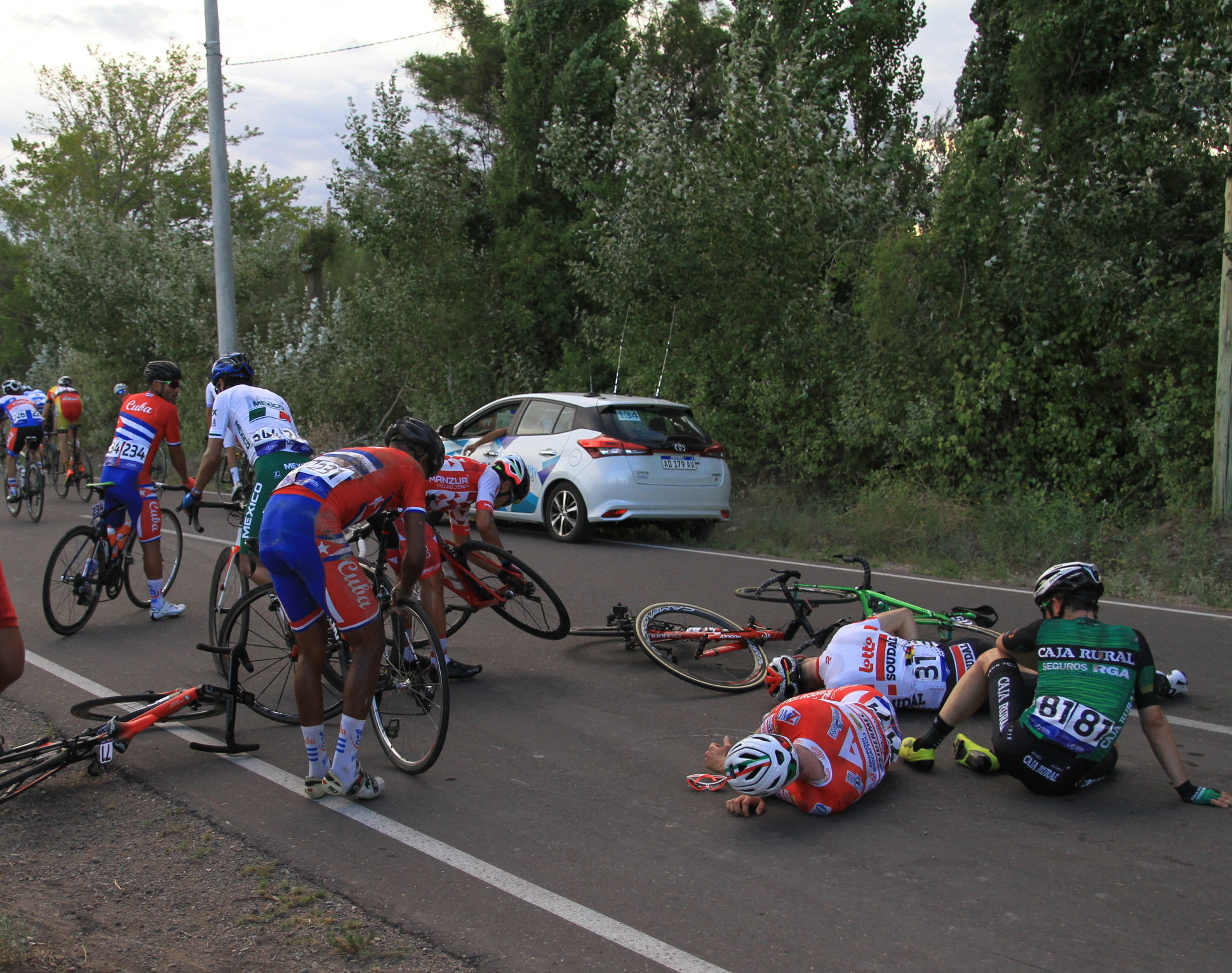 Caída I. Varios ciclistas del Androni, del Caja Rural, del seleccionado de Cuba y del Bora se cayeron saliendo de calle Las Moras. Caída III. El bonaerense Maxi Richeze, del Deceunink Quick Steep no quedó al margen del clásico del día.