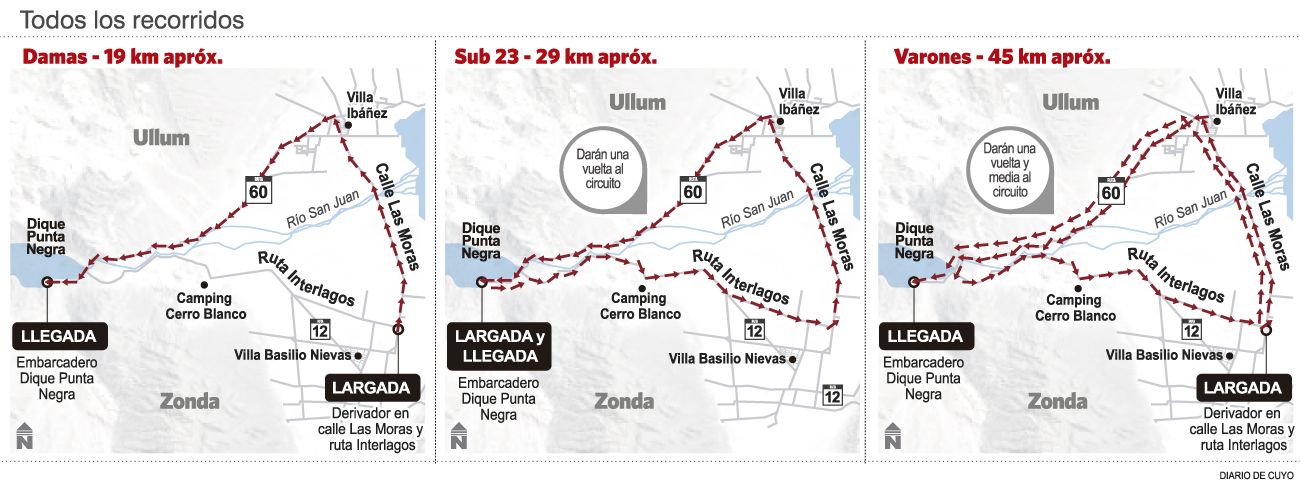 La prueba de Sub-23 será la única que largue y finalice en el mismo lugar a metros del Embarcadero. Viajarán hacia el Este costeando el dique por Zonda, llegarán hasta el derivador y allí comenzará la parte dura porque ascenderán hasta Punta Negra por Ullum, recorriendo 29 kilómetros. Damas y varones largarán desde el derivador de calle Las Moras. Las damas recorrerán 19 kilómetros largando desde esa rotonda y ascendiendo a Punta Negra por Ullum. Mientras que los varones Elite partirán desde ese derivador y darán una vuelta y media, por lo que ascenderán dos veces el paredón de Punta Negra (45 kilómetros).