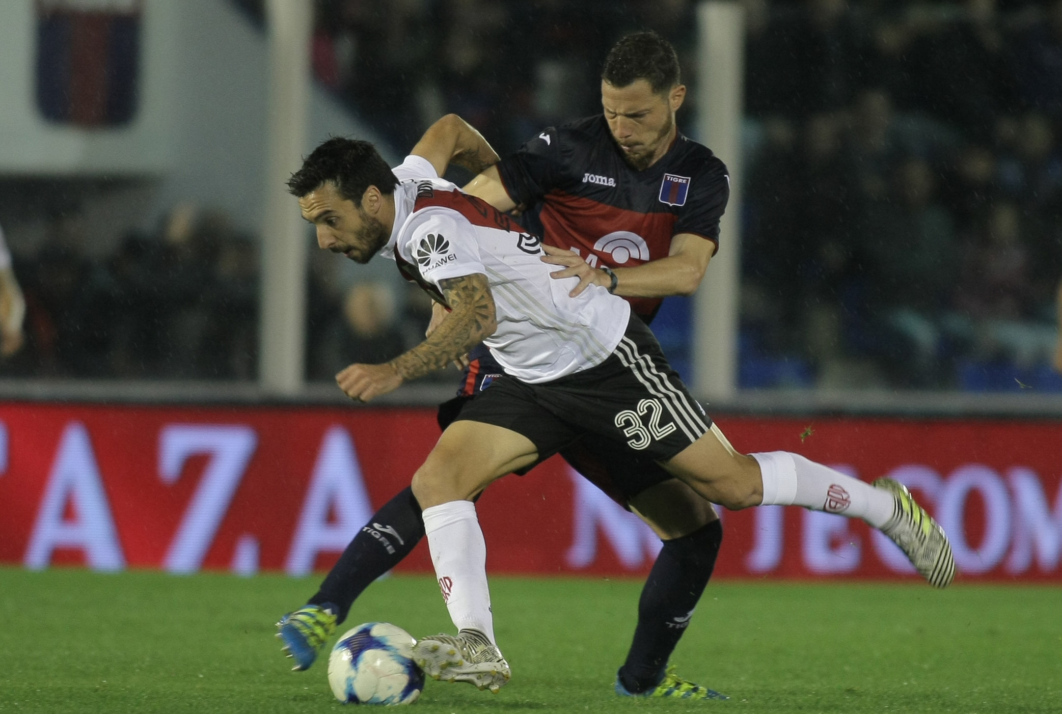Bajo una intensa lluvia, Tigre comenzó ordenado y presionando arriba, pero el que encontró el gol fue River, luego de que Ignacio Fernández recibiera un pase en profundidad de Enzo Pérez y fuera derribado en el área por Gastón Bojanich.