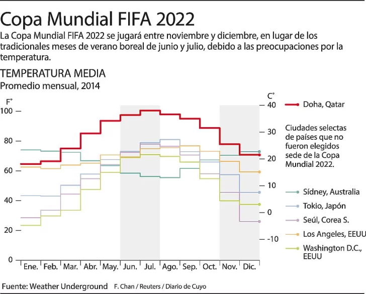 Qatar, 20 de marzo.- "Los estadios tendrán una temperatura que rondará entre los 24 y los 26° en el campo de juego y entre 24 y 28° en las tribunas". Luego de quem la FIFA anunciara que el Mundial 2022 se jugará por primera vez en noviembre y diciembre, en Qatar no pierden tiempo y desarrollan un sistema de refrigeración.