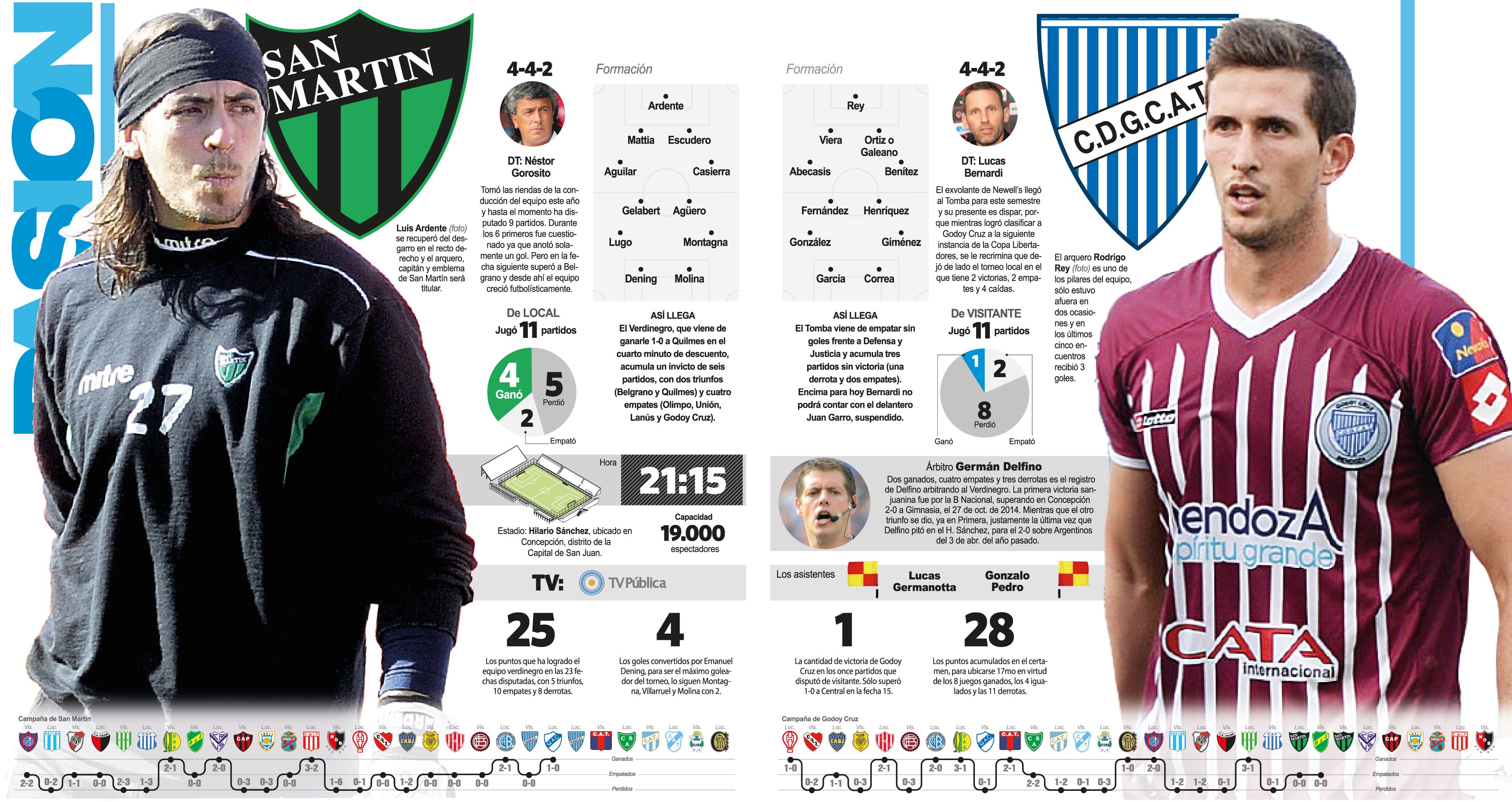 El Verdinegro recupera a su emblema Luis Ardente en el arco tras el desgarro en el recto que lo dejó afuera las dos últimas fechas, mientras que el resto del equipo es el que viene de superar a Quilmes 1-0. En tanto que Godoy Cruz no podrá contar con el delantero Juan Garro, expulsado en el empate 0-0 ante Defensa, pero retornará a la titularidad el mediocampista Fabián Henríquez, y con la esperanza en el regreso del "Morro" García.