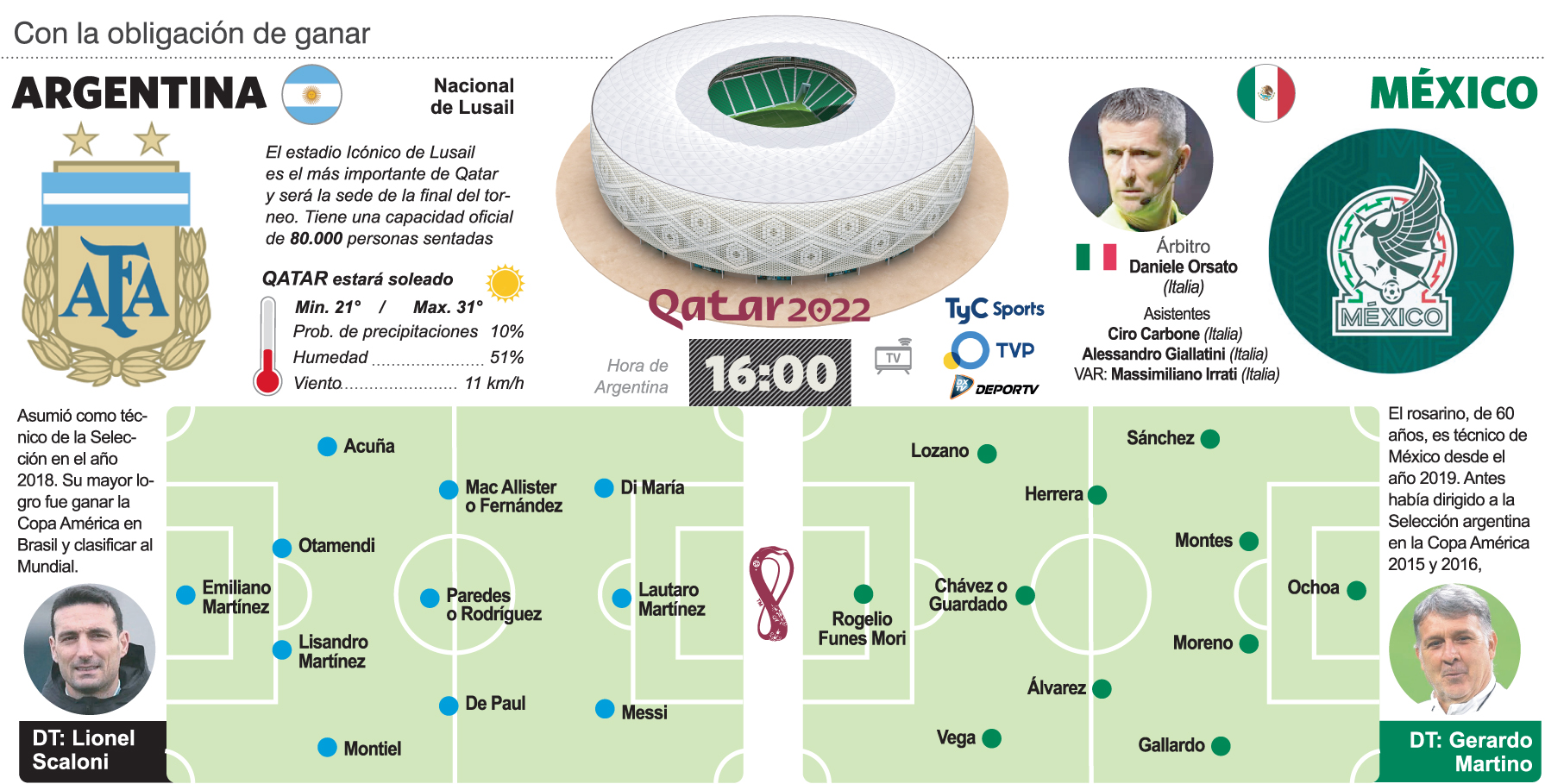 No importan las formas. Ni siquiera las tácticas y los nombres. Para la Selección argentina de fútbol sólo importa hacerse dueña de los tres puntos para seguir en carrera en el Mundial Qatar 2022. Enfrente estará la Selección de México, un equipo que siempre les ha hecho pata ancha a los albicelestes pero que a la larga ha terminado perdiendo esos parejos partidos. Hoy es el día. Desde las 16. A esa hora empezará a escribirse otro capítulo importante en la vida futbolera argentina. Una derrota deja a la Argentina afuera de todo. Un empate, con un pie fuera del Mundial. Y una victoria le estira la vida.
