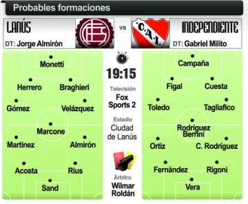 En el último campeón del fútbol argentino, el entrenador Jorge Almirón realizaría un solo cambio respecto de los once que obtuvieron la Copa Bicentenario ante Racing: Ciro Rius en lugar del lesionado Nicolás Aguirre. Por su parte, Gabriel Milito no contará con Hernán Pellerano porque a pesar de estar mejor de una sobrecarga muscular no cree ‘que llegue para jugar‘. Tras una pretemporada sin encontrar un correcto funcionamiento y con la eliminación de la Copa Argentina, Milito tan solo pondrá en cancha a uno de los refuerzos: Jorge Figal.