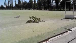 La última vez que fue utilizado el campo de juego fue en el pasado mes de diciembre. Los problemas que enfrentan las instalaciones son de variada naturaleza, pero el principal sería el de la bomba de agua que lo abastece, la que se encuentra inutilizable. Según los trabajadores del lugar, la máquina no puede extraer agua porque en el fondo de la napa hay una piedra que lo impide. “Sé que es muy caro, pero lo ideal sería hacer un pozo de 120 metros y volver a contar con el agua para que la cancha pueda alimentarse”, expresó una portera del Instituto Superior de Educación Física Nº 20, más conocido como La Granja. A esto debe sumársele que el césped artificial está gastado y rajado en algunas zonas, los arcos tienen huecos en sus bases y los desagües están tapados con basura.