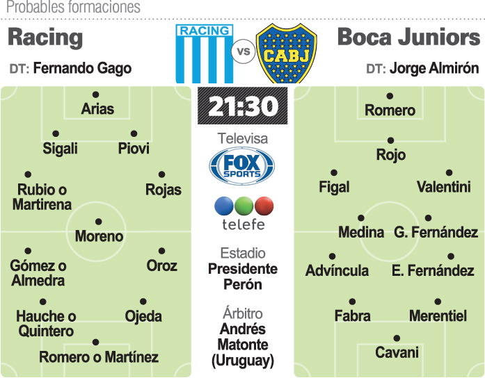 Racing Club y Boca Juniors, los únicos dos equipos argentinos del torneo, se enfrentarán hoy en Avellaneda para definir a uno de los cuatro semifinalistas de la Copa Libertadores de América. El partido, válido por la revancha de los cuartos de final, se jugará desde las 21.30 en el estadio de la Academia, con el arbitraje del uruguayo Andrés Matonte. En el partido de ida, jugado en la Bombonera, empataron 0-0.