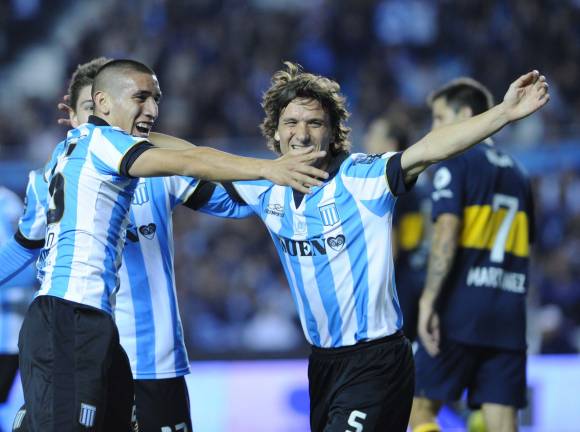 El público del Racing Club ya estaba de fiesta ayer desde antes de que comenzara el juego y su equipo redondeó una noche perfecta con una muy buena producción colectiva y un triunfo por 2-0 sobre un Boca Juniors que fue haciéndose sencillo por las facilidades que dio el adversario, y que inclusive pudo haber sido más amplio. Luciano Vietto y Luis Fariña, secundados por Rodrigo De Paul y por Adrián Centurión, le dieron a Racing muy buena circulación de pelota en ataque, aunque les faltó ser más directos en la resolución de varias acciones como para aumentar la cuenta de goles. El partido comenzó jugándose muy lejos de los arcos, con mayor posesión de Boca, que tuvo una oportunidad en el minuto 11, cuando Nicolás Blandi recibió de frente al arco un rechazo apresurado de Matías Cahais y remató desviado sobre palo izquierdo. En el minuto 20, Rodrigo De Paul ejecutó un tiro libre desde la derecha y, en el amontonamiento de jugadores de los dos equipos, Guillermo Burdisso de cabeza venció su propia valla y puso en ventaja a Racing.
