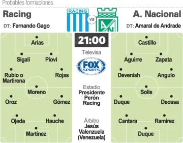 Racing Club será local hoy ante Atlético Nacional de Colombia, con la obligación de ganar por dos goles para mantenerse con chances de pasar a la siguiente fase, en un encuentro válido por la vuelta de los octavos de final de la Copa Libertadores de América. El partido se jugará desde las 21 en el estadio Presidente Perón de Avellaneda, contará con el arbitraje del venezolano Jesús Valenzuela y la transmisión de TV estará a cargo de la señal de cable Fox Sports. En la ida, el jueves pasado en Medellín, la "Academia" cayó por 4 a 2, por lo que está obligado a ganar por al menos dos goles de diferencia para tener la posibilidad de definir el pase a cuartos de final por penales.