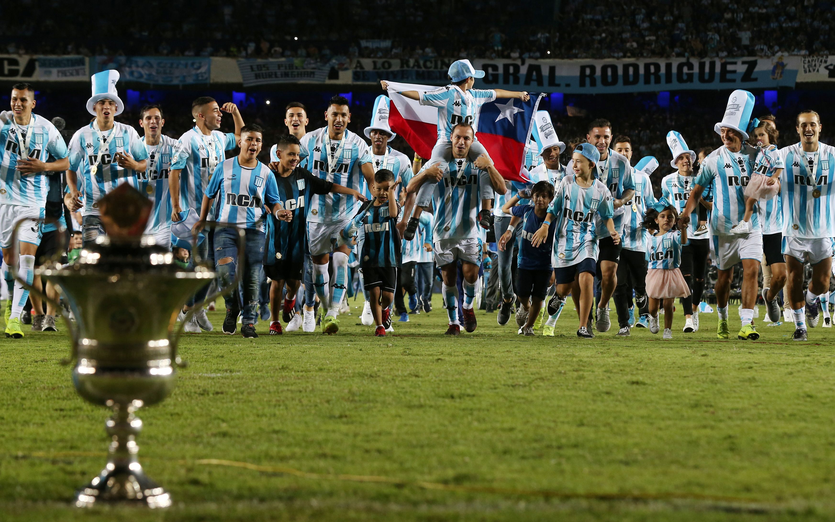 La copa se mira y no se toca. El plantel de Racing completo, los jugadores acompañados por sus hijos corren al preciado trofeo puesto en juego por la Superliga.