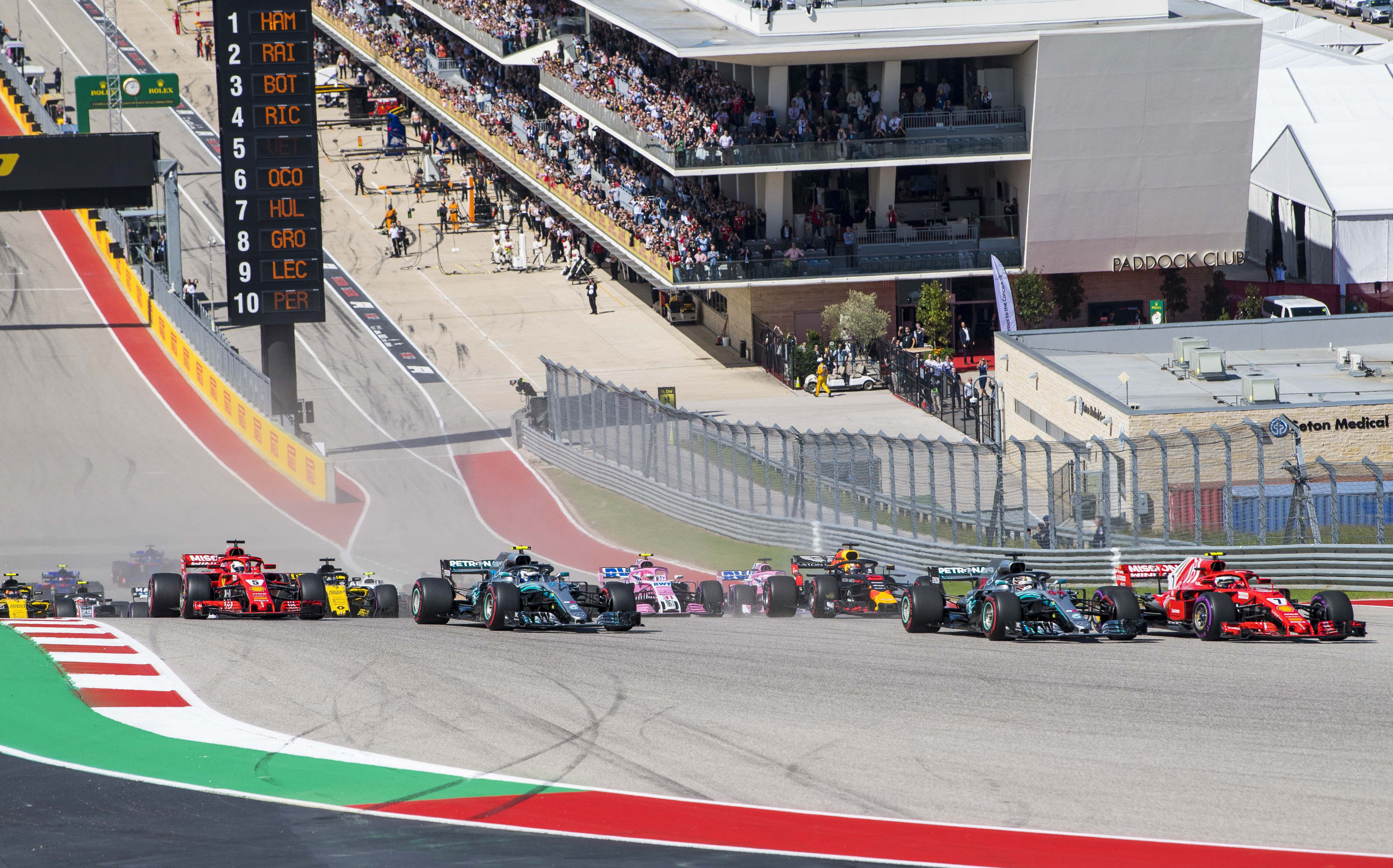 Largada. Kimi Raikkonen lidera el pelotón de autos de la Fórmula 1 en el GP de Estados Unidos, que no pudo ver coronarse a Hamilton como nuevo campeón del mundo. Ferrari no ganaba en Texas desde hacía 12 años.