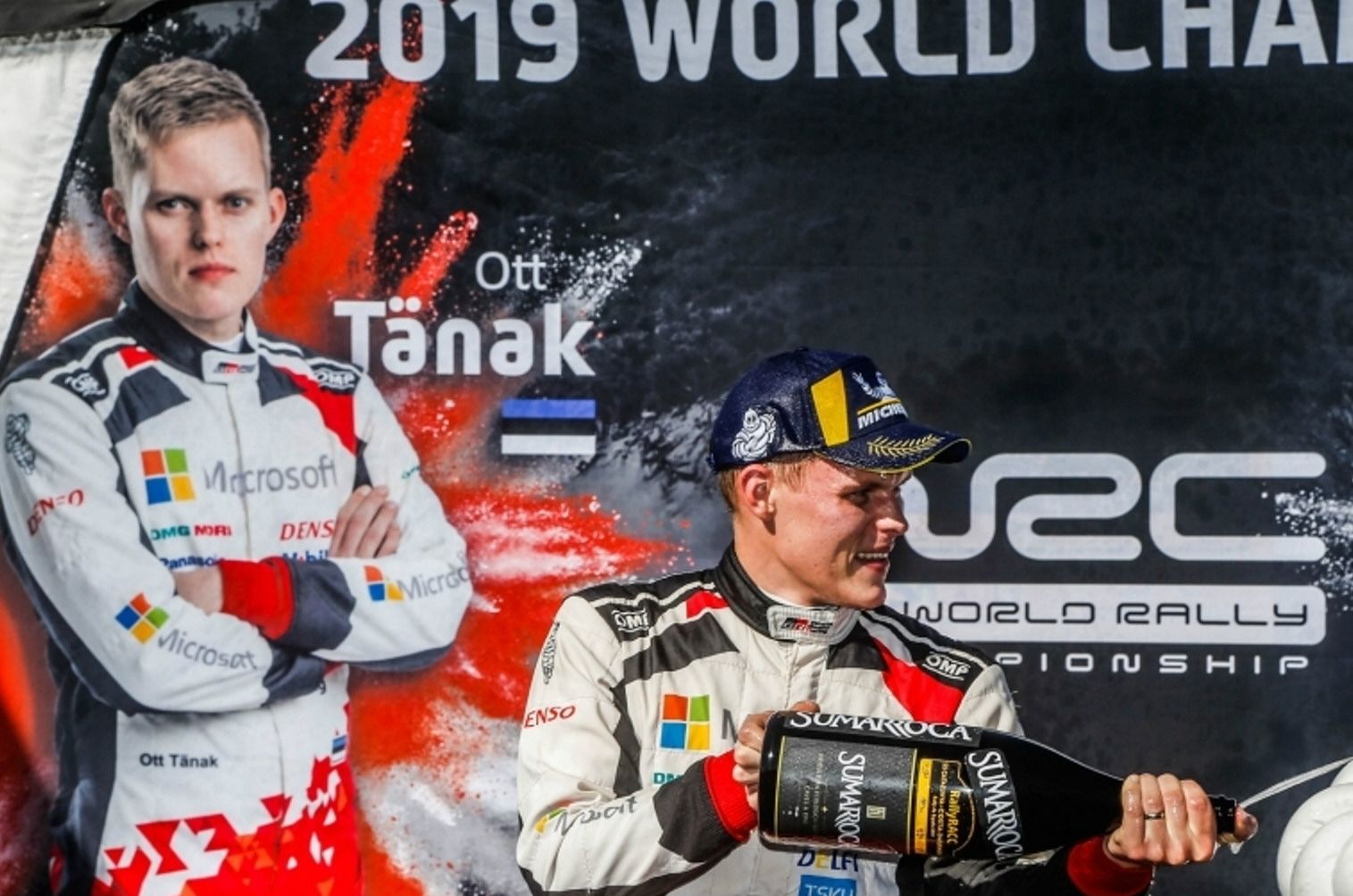 En el podio. Con champán, Ott Tänak celebra el podio logrado en Cataluña-España, que de paso lo consagró campeón mundial 2019.