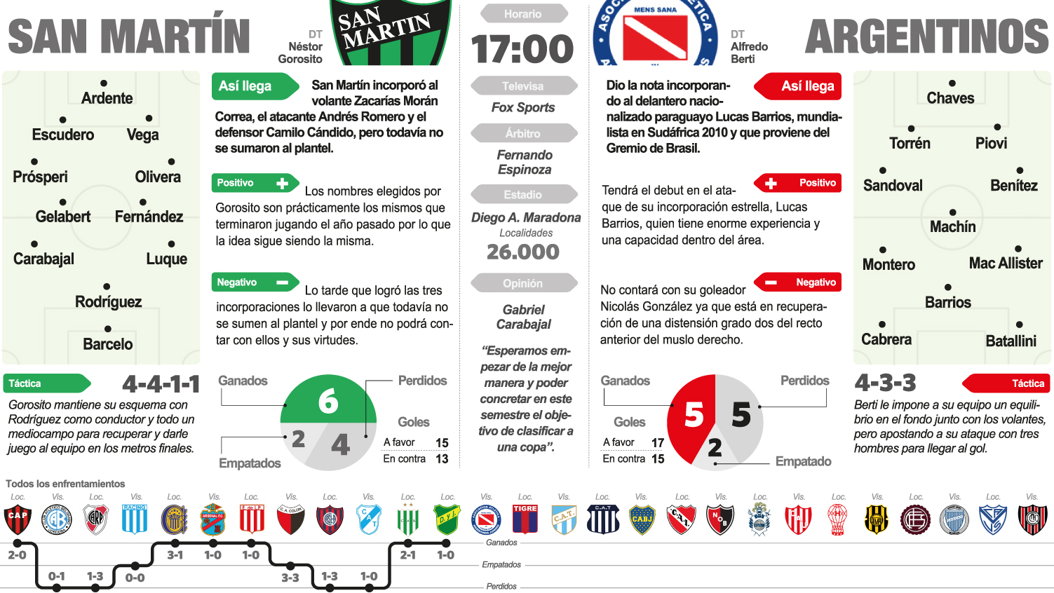 San Martín saltará a la cancha con las mismas caras, ya que los tres refuerzos, el volante Zacarías Morán Correa, el atacante Andrés Romero y el defensor uruguayo Camilo Cándido, todavía no se sumaron al plantel de Néstor Gorosito. Por ello es que el equipo para esta tarde será casi el mismo que terminó jugando el año pasado.