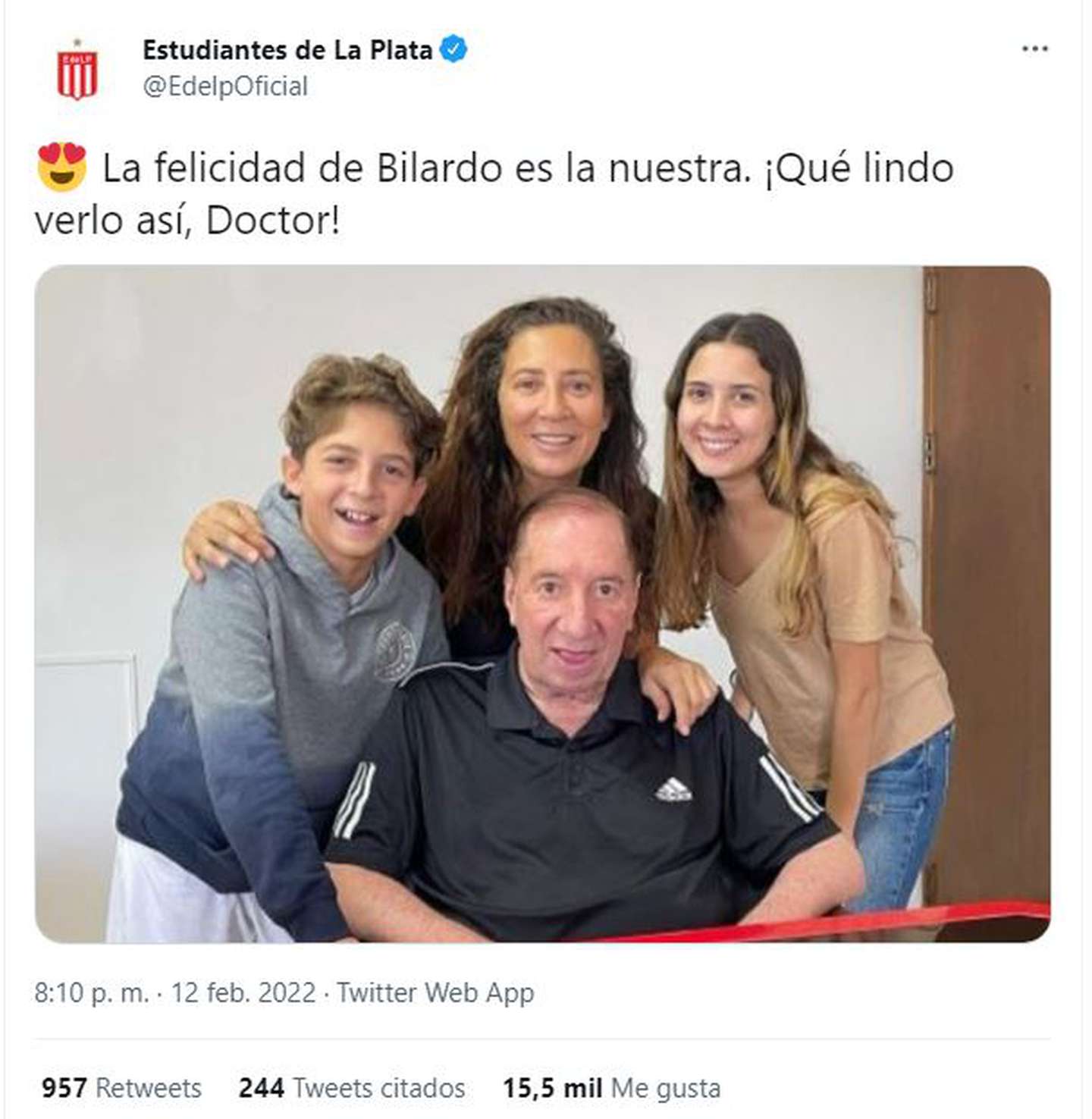 Carlos Salvador Bilardo reapareción en una foto familiar que publicaron las redes sociales de Estudiantes de La Plata y generó una repercusión positiva en cuanto a su estado de salud, luego de haber permanecido internado en los últimos cuatro años por una enfermedad neurodegenerativa.