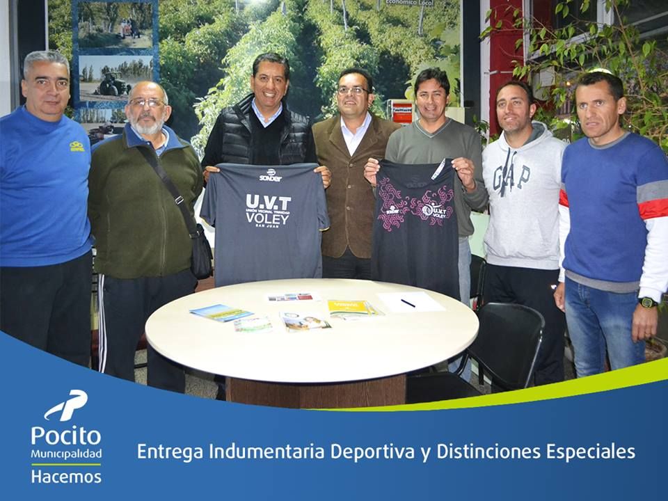 El Fabian Aballay recibió a Carlos Quinteros, Presidente de la Sub-Comisión de Vóley de UVT; al Pro-Secretario de la Federación Sanjuanina de Vóley, Roberto Díaz y a los técnicos Ariel Fachineli y Raúl Velásquez, quienes le entregaron a modo de agradecimiento una camiseta por la colaboración con el equipo de la Liga Nacional Serie A2 de Vóley Masculino. Junto a Coordinador de Deportes y el Coordinador de Promoción Deportiva del municipio, el Intendente Fabian Aballay hizo entrega de indumentaria deportiva a integrantes de clubes, uniones vecinales y equipos barriales de Pocito, en un acto realizado en dependencias de ADEL.