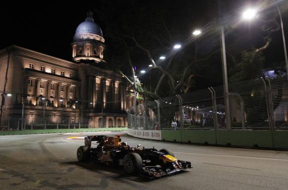 El piloto alemán Sebastian Vettel, con un Red Bull, resultó el mejor de los entrenamientos de la Fórmula 1 que se desarrollaron en Singapur y con luz artificial. El tiempo fue de 1m.46s.660/1000. muy cerca finalizó su compañero Webber a 627/1000. Cuarto clasificó Alonso y su Ferrari. MAñana se larga la final a las 9 de Argentina.