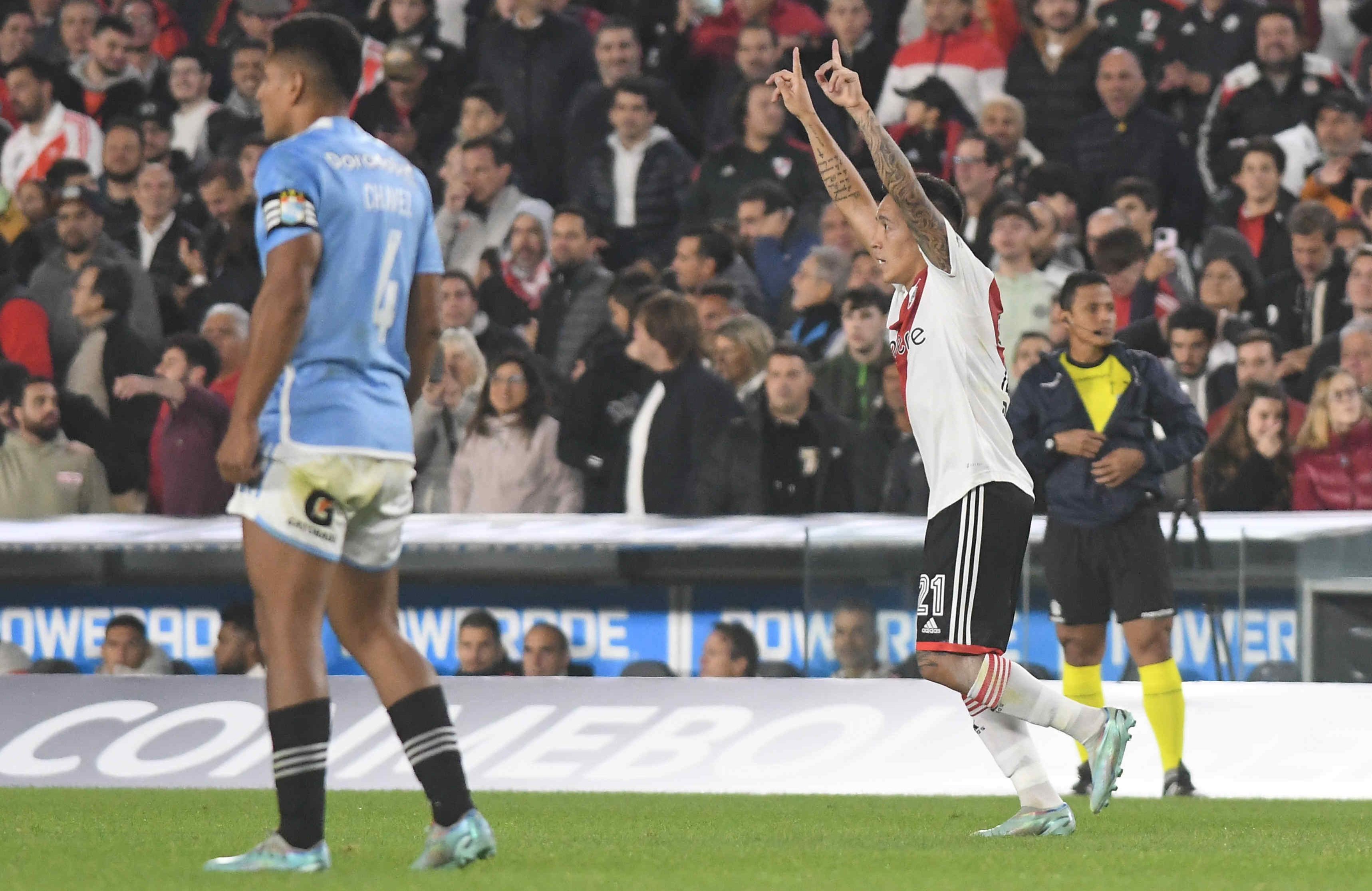Pero el destino le tendría preparado un par de escollos más al anfitrión. A los 38, Washington Corozo quedó corriendo solo rumbo a Franco Armani, se le cruzó Enzo Díaz en la media luna y se ganó la tarjeta roja por último recurso. Para más dificultad, Corozo ejecutó magistralmente ese mismo tiro libre y lo colocó a la izquierda del arquero a los 40′. Dos a dos y a empezar de nuevo.