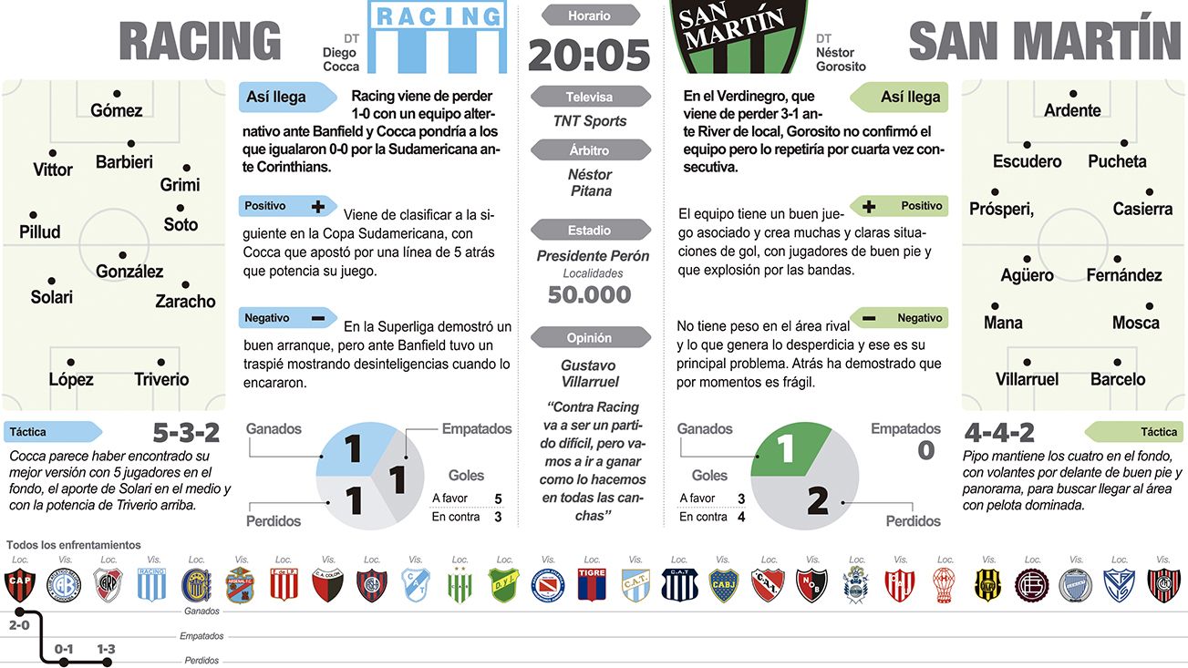 Los ecos de los caídas ante Belgrano y River todavía pesan en San Martín, que esta noche, a las 20.05 (televisa TNT Sports), tendrá revancha cuando enfrente en Avellaneda a Racing, en la continuidad de la 4ta fecha de la Superliga de fútbol.