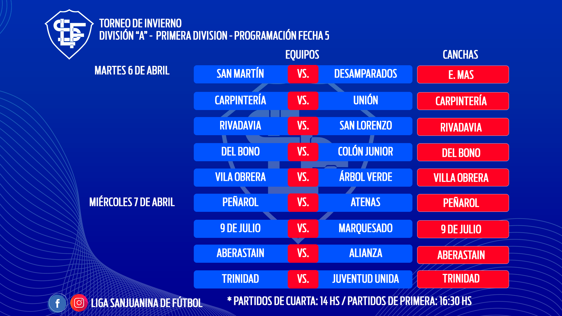 El D3 de la Policía de San Juan le informó a la Liga Sanjuanina de Fútbol que queda reprogramada la quinta fecha de la Primera A por el operativo de Semana Santa.