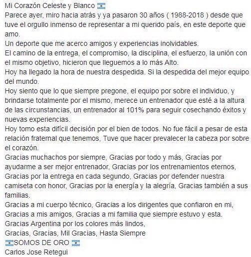 Carlos Retegui anunció su renuncia a la dirección técnica de la selección masculina de hockey, Los Leones, equipo con el que consiguió la histórica medalla dorada en los Juegos Olímpicos de Rio de Janeiro. Lo hizo a través de un comunicado en sus redes sociales.