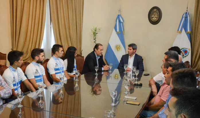 En la mañana de ayer el gobernador Sergio Uñac recibió la visita de la delegación sanjuanina que ganó el medallero en el último “Argentino de Ruta”. Sergio y Duilio Ramos, Mauricio Graziani y Maribel Aguirre, acudieron con las casacas que los identifican como monarcas nacionales.