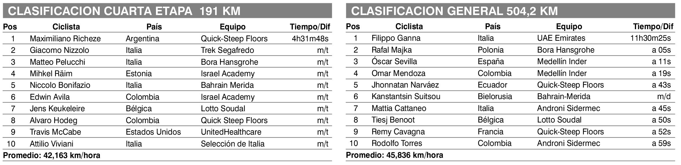 El bonaerense Maximiliano Richeze (Quick-Steep Floors) ganó ayer la cuarta etapa de la 36ta Vuelta a San Juan, el parcial inédito que unió Jáchal con Valle Fértil, pasando por la puerta del Valle de la Luna. El “Atómico” asumió con autoridad la postura de líder de su conjunto ante la baja obligada por una rodada del colombiano Fernando Gaviria. La general no sufrió mayores variantes en sus cuatro primeros puestos, pero sí desde el quinto hacia atrás porque el chubutense Eduardo Sepúlveda (Movistar) se retrasó y el sanjuanino Ricardo Escuela (Agrupación Virgen de Fátima) que junto a Rubén Ramos (Selección Argentina) y el italiano Manuel Belletti (Androni-Siderme), cayeron con Gaviria y debieron abandonar.
